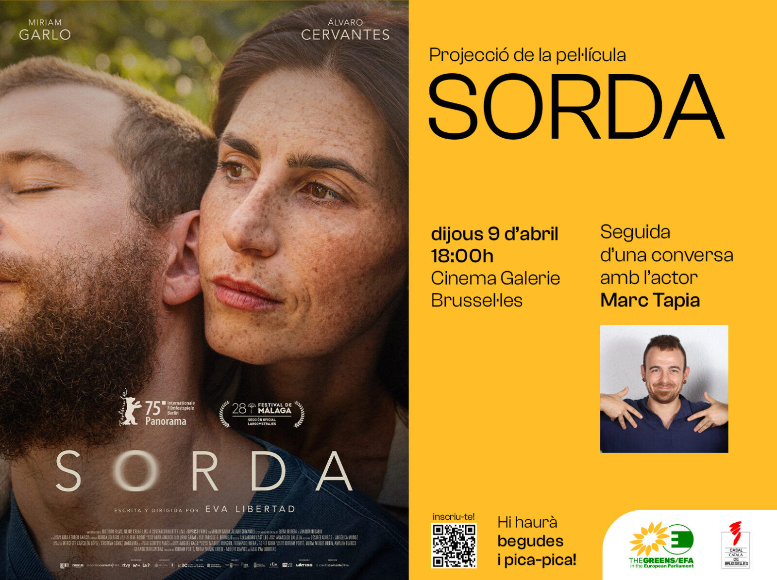 [CAT] Projecció de la pel·lícula Sorda, nominada al LUX Audience Award del Parlament Europeu, en un acte organitzat per l’eurodiputada Diana Riba i Giner conjuntament amb el Casal Català de Brussel·les. L’acte tindrà lloc el dijous, 9 d’abril a les 18:00h al Cinema Galeries, 26 Galerie de la Reine, 1000 Brussels. La sessió inclourà una breu presentació, la projecció del film i un col·loqui posterior amb la participació de l’actor de la pel·lícula Marc Tapia. Abans de la projecció hi haurà una copa de benvinguda i, en acabar, una petita recepció amb begudes. Amb la voluntat que l’esdeveniment sigui el més inclusiu possible, la presentació i el col·loqui comptaran amb interpretació en llengua de signes catalana. Ompliu aquest formulari per confirmar la vostra assistència a l’esdeveniment. [ENG] Screening of the film Sorda, nominated for the European Parliament’s LUX Audience Award, in an event organised by MEP Diana Riba i Giner together with the Casal Català de Brussel·les. The event will take place on Thursday, 9 April at 18:00 at Cinema Galeries, 26 Galerie de la Reine, 1000 Brussels. The evening will include a short introduction, the screening of the film and a Q&A afterwards with the participation of one of the film’s actors, Marc Tapia. There will also be a welcome drink before the screening and a small reception with drinks after the event. In order to make the event as inclusive as possible, the introduction and the Q&A will include interpretation into Catalan Sign Language. Please fill in this form to confirm your attendance at the event.